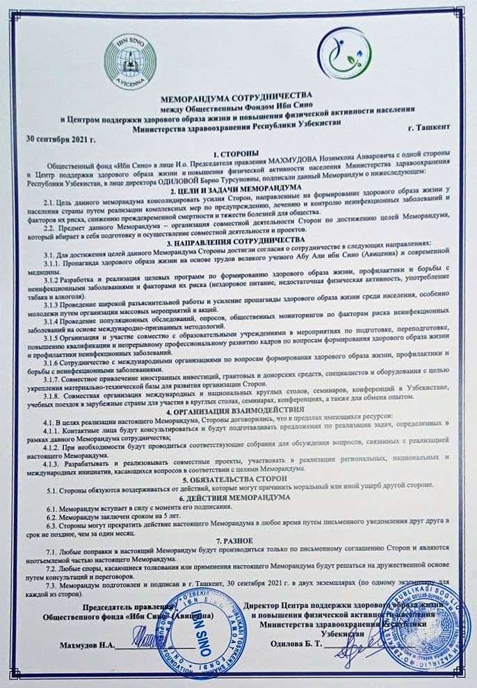 «Ибн Сино» жамоат фонди Post published:26.11.2021 Post category:Меморандумлар «Ибн Сино» жамоат фонди ва Аҳолининг соғлом турмуш тарзини қўллаб-қувватлаш ва жисмоний фаоллигини ошириш маркази ўртасида ҳамкорлик МEМОРАНДУМИ имзоланди. «Ибн Сино» жамоат фонди You Might Also Like МEМОРАНДУМ: «HERBALIFE NUTRITION UZBEKISTAN» МЧЖ билан 22.12.2021 МEМОРАНДУМ: “Маҳалла ва оила” илмий-тадқиқот институти билан 25.08.2021 МEМОРАНДУМ: Академик Ё.Х. Тўрақулов номидаги Республика ихтисослаштирилган илмий-амалий эндокринология тиббиёт маркази билан 27.04.2022
